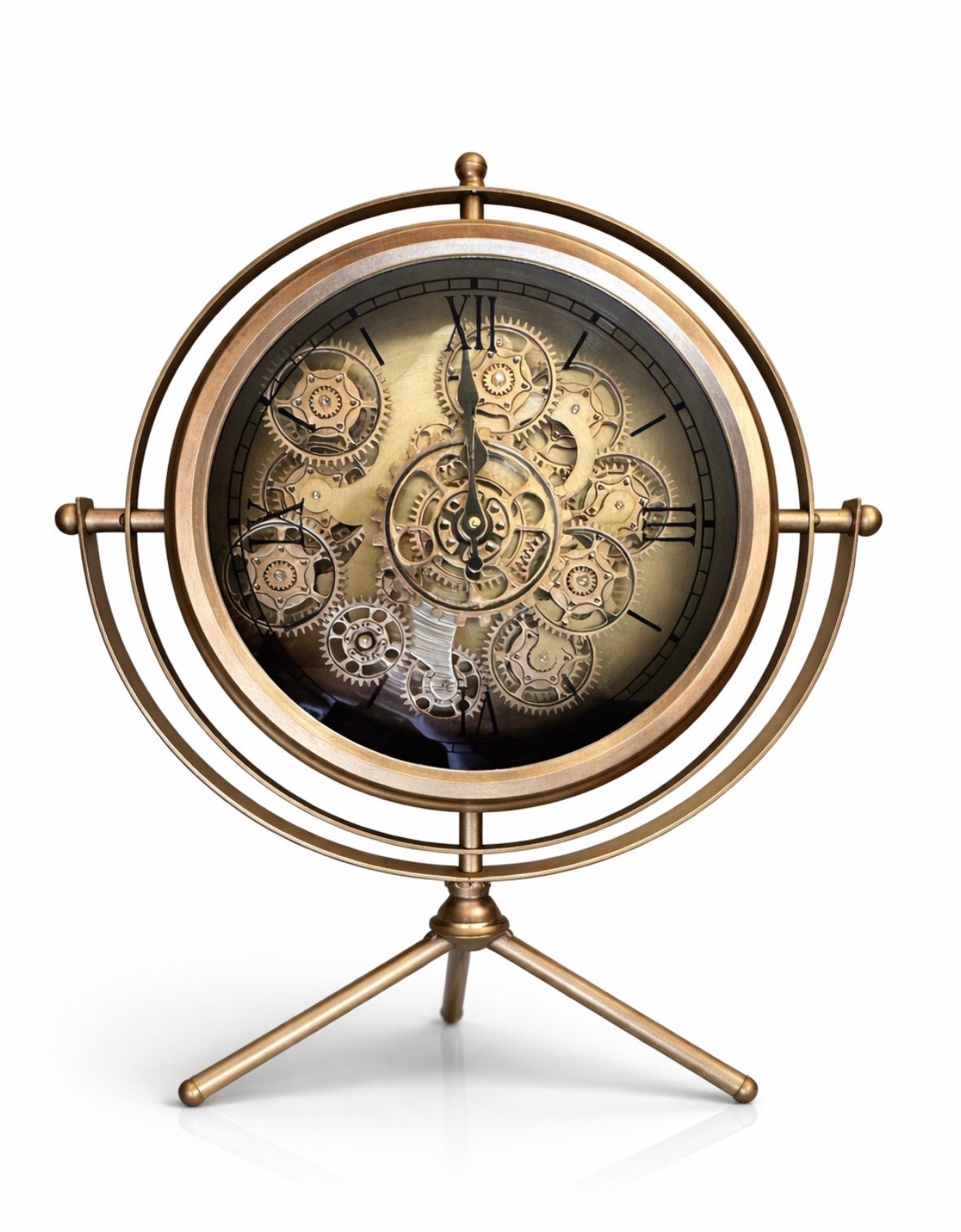 The clock face itself has Roman numerals, reinforcing its antique appearance, and the hands are long and slender, moving smoothly over the surface. The cogs beneath the face are in constant motion, hinting at the complex engineering beneath the simplicity of timekeeping. The dark background contrasts sharply with the gleaming metal, making the cogs stand out even more. This timepiece is more than just a clock—it’s a testament to craftsmanship, blending form and function in an evocative, mechanical masterpiece.