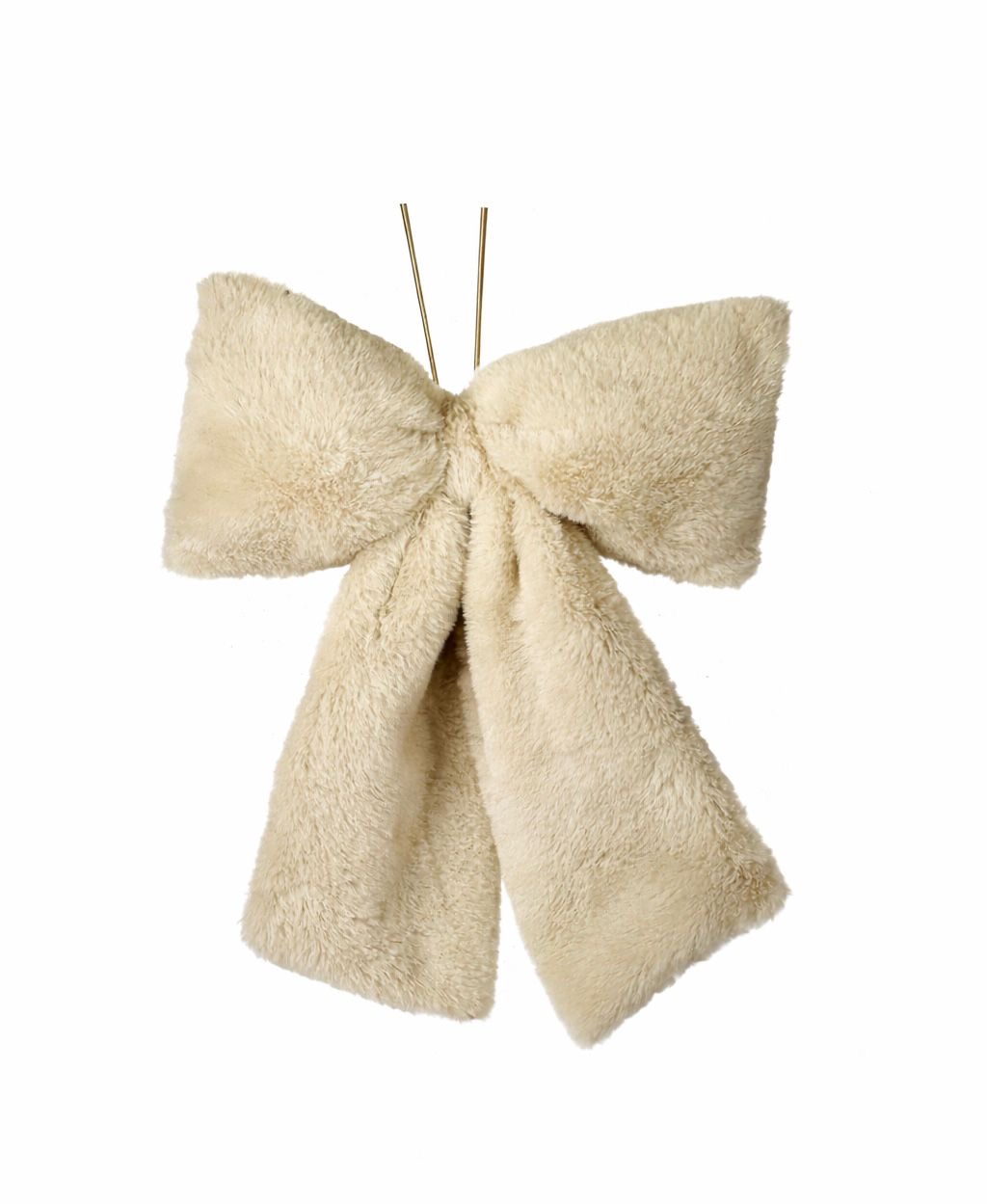Crafted from ultra-soft faux fur in a warm neutral tone, the bow features full, voluminous loops and flowing tails that create a rich, layered look. Subtle gold-tone hanging stems add a refined finish, making it easy to display on Christmas trees, wreaths, garlands, or even as a decorative accent on gifts.