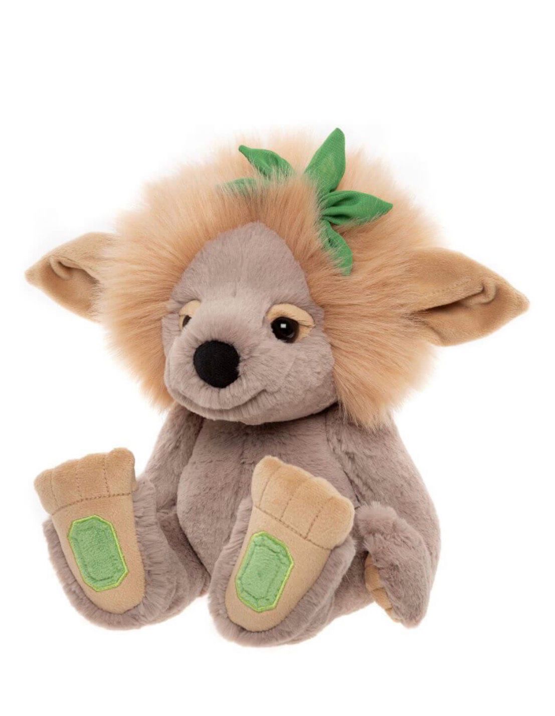 Her plush, light brown toned fur is luxuriously soft, complemented by a thick, honey-toned mane that frames her sweet face. Hints of emerald, green peek through with gemstone-style paw pads and floral accents tucked into her mane, giving her a subtle, nature-inspired sparkle. With a soft, squishy, non-jointed body, Emerald Lou is perfect for cuddles or simply being close when comfort is needed most.